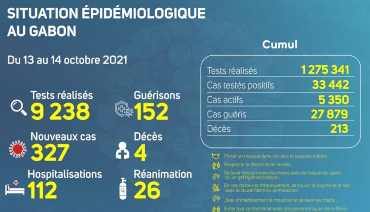 327 nouveaux cas positifs enregistrés sur 9 238 tests réalisés, soit un taux de positivité de 3.5%, 112 personnes hospitalisées dont 26 en réanimation pour détresse respiratoire, 152 nouvelles guérisons et 04 nouveaux décès à Libreville voilà les statistiques que nous donne le Comité de pilotage du plan de veille et de Riposte contre l’épidémie à Coronavirus au Gabon ce jour sur la situation épidémiologique du 13 au 14 octobre 2021